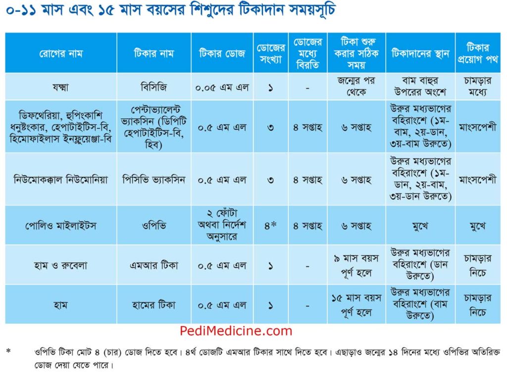 | ১. যক্ষা ২. পোলিও-মাইলাইটিস ৩. ডিপথেরিয়া, হুপিংকাশি, ধনুষ্টংকার, হিমোফাইলাস বি ইনফ্লুয়েঞ্জা, হেপাটাইসিস বি ৪. নিউ্যমোকক্কাল নিউ্যমোনিয়া ৫. হাম ও রুবেলা ৬. ধনুষ্টংকার | ১. বিসিজি ২. ওপিভি ৩.পেন্টাভেলেন্ট ৪. পিসিভি ৫. এম আর ৬. টিটি |